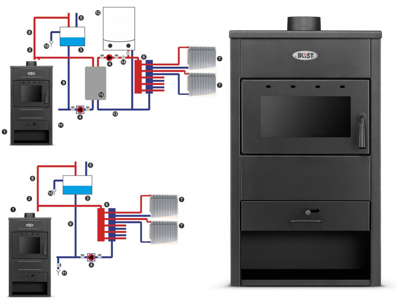 Печь оснащена водяным контуром объёмом 19 литров, что выгодно отличает ее от печей-каминов других производителей, которые оснащены небольшим теплообменником объемом 1,2-4л, имеющим мощность около 5кВт. Такие теплообменники устанавливаются в верхней части топочной камеры, когда в модели Padova E, как и у отопительных котлов, имеется водяная рубашка, окружающая топочную камеру почти со всех сторон. Благодаря этому печь-камин Blist Padova E имеет номинальную мощность водяного контура 14.6 кВт, а в помещение, в котором она установлена, она отдает 4.1 кВт. Данные характеристики приближают печь по своему функционалу к небольшим отопительным котлам, но, в отличие от котлов, ее можно установить в гостиной и наслаждаться красотой огня.