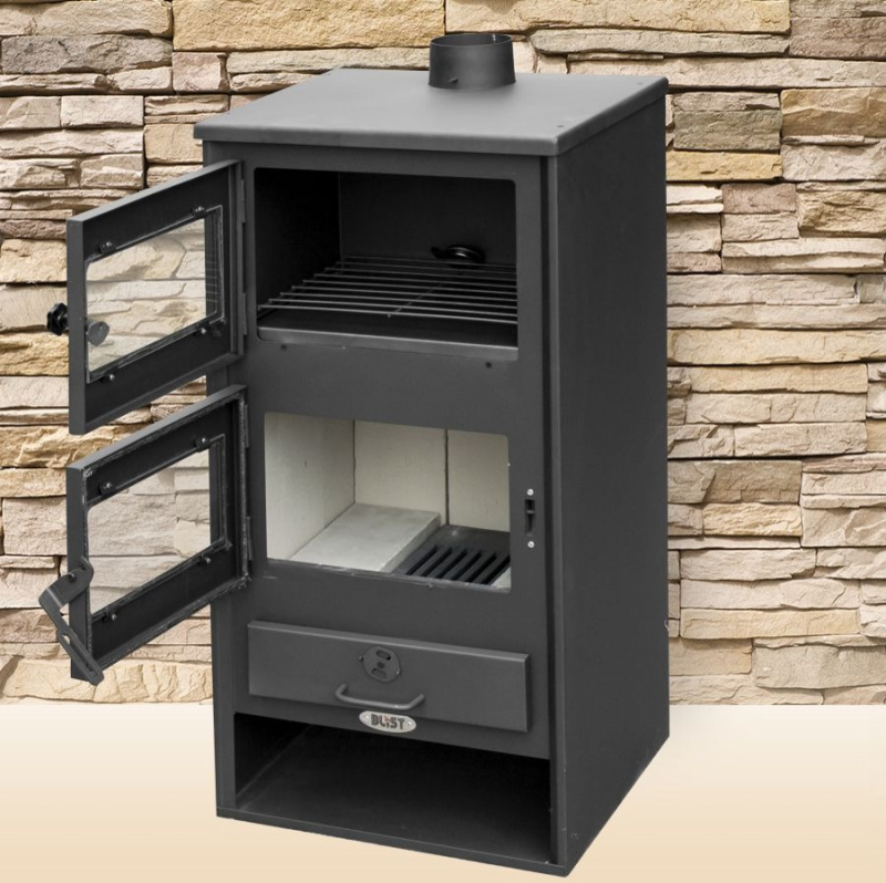 Печь-камин Blist Napoli оснащена духовым шкафом для приготовления пищи. Печь изготовлена из стали, а топочная камера выложена шамотом.