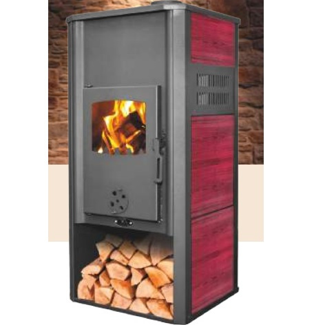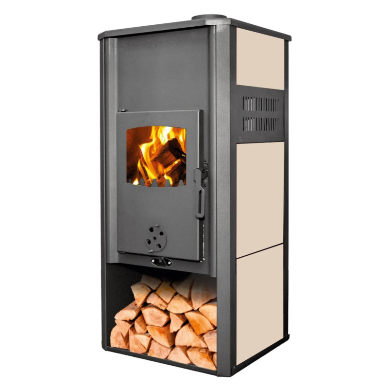Боковые стенки печи облицованы керамической плиткой бежевого или красного цвета.